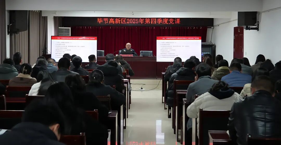 12月12日,毕节高新区党工委委员、管委会副主任唐璇为毕节高新区党员干部讲授2025年第四季度党课,深入学习贯彻党的二十届四中全会精神,引导党员干部进一步统一思想、深化认识,将学习成果转化为推动高新区高质量发展的强大动力。
