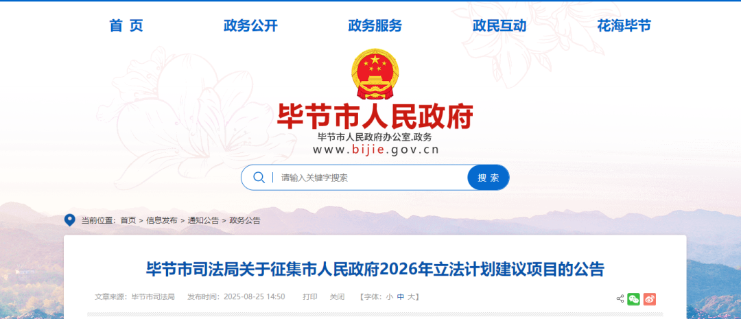 为做好市人民政府2026年度立法计划编制工作,提升立法项目的科学性、可行性、针对性,推动政府立法工作高质量发展。根据《毕节市人民政府起草地方性法规草案和制定市人民政府规章程序办法》有关规定,现面向社会公开征集市人民政府2026年度立法计划建议项目。