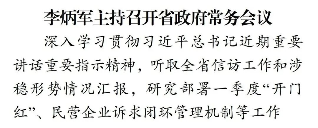 3月2日,省委副书记、省长李炳军主持召开省政府常务会议,深入学习贯彻习近平总书记近期重要讲话重要指示精神,听取全省信访工作和涉稳形势情况汇报,研究部署一季度“开门红”、民营企业诉求闭环管理机制等工作。