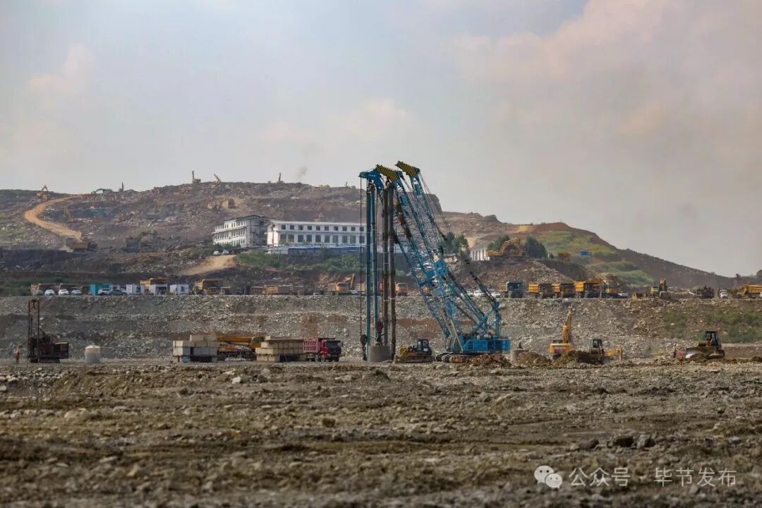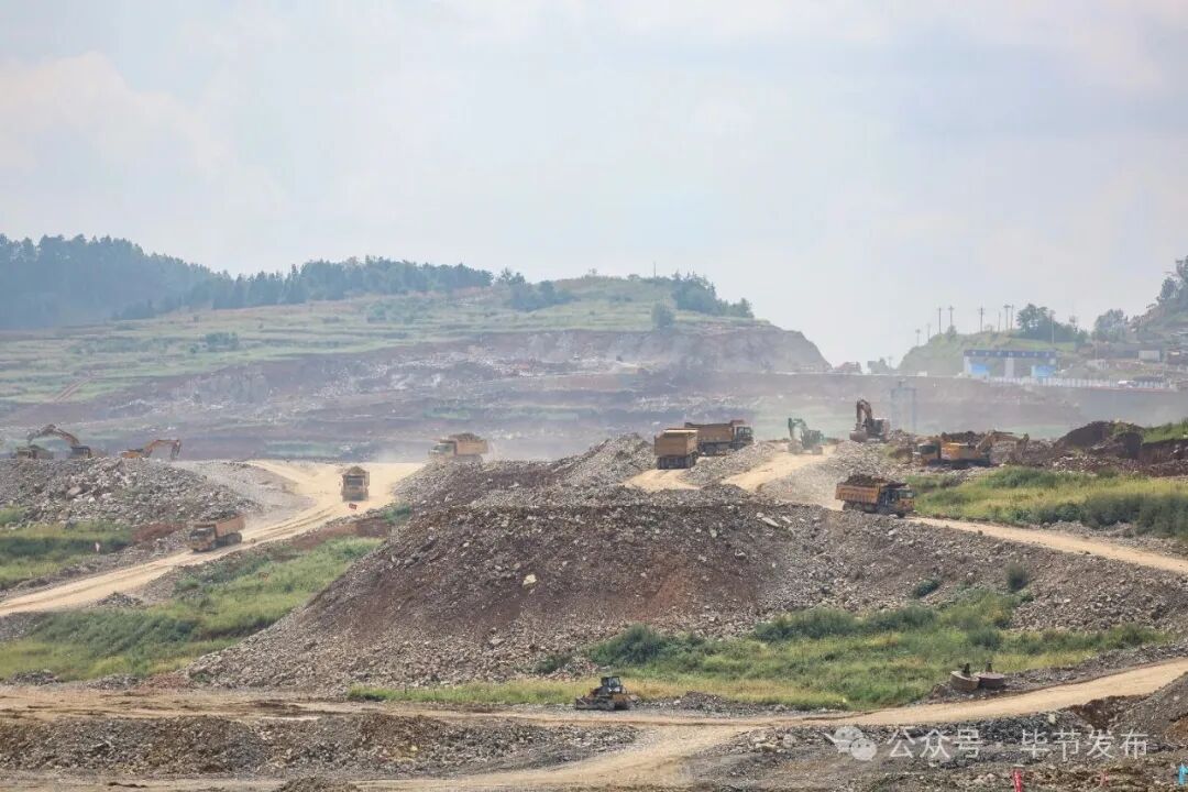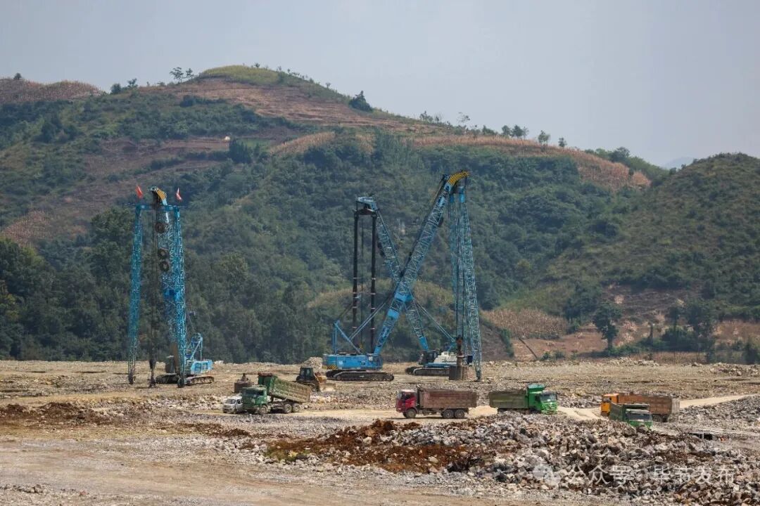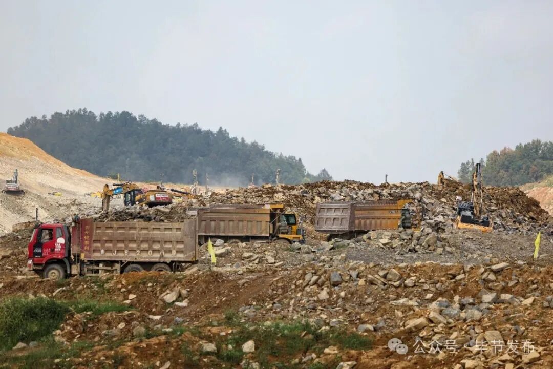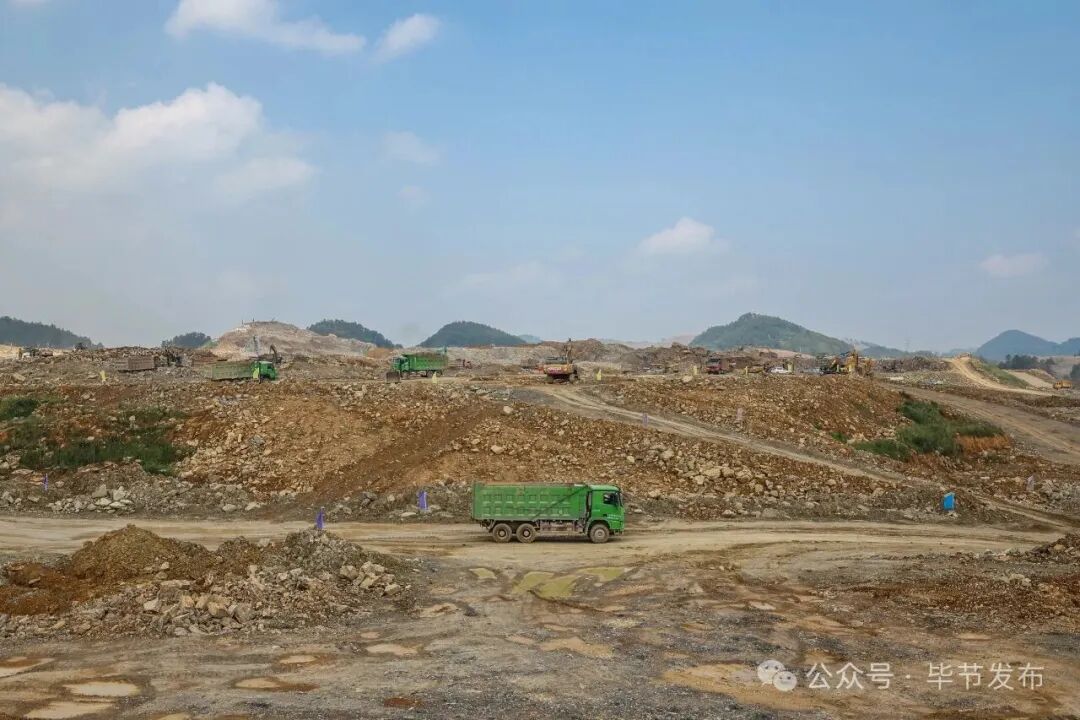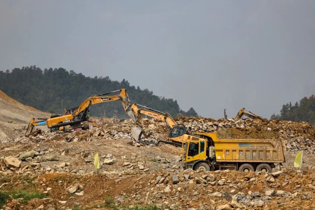 现场机器轰鸣、车流穿梭